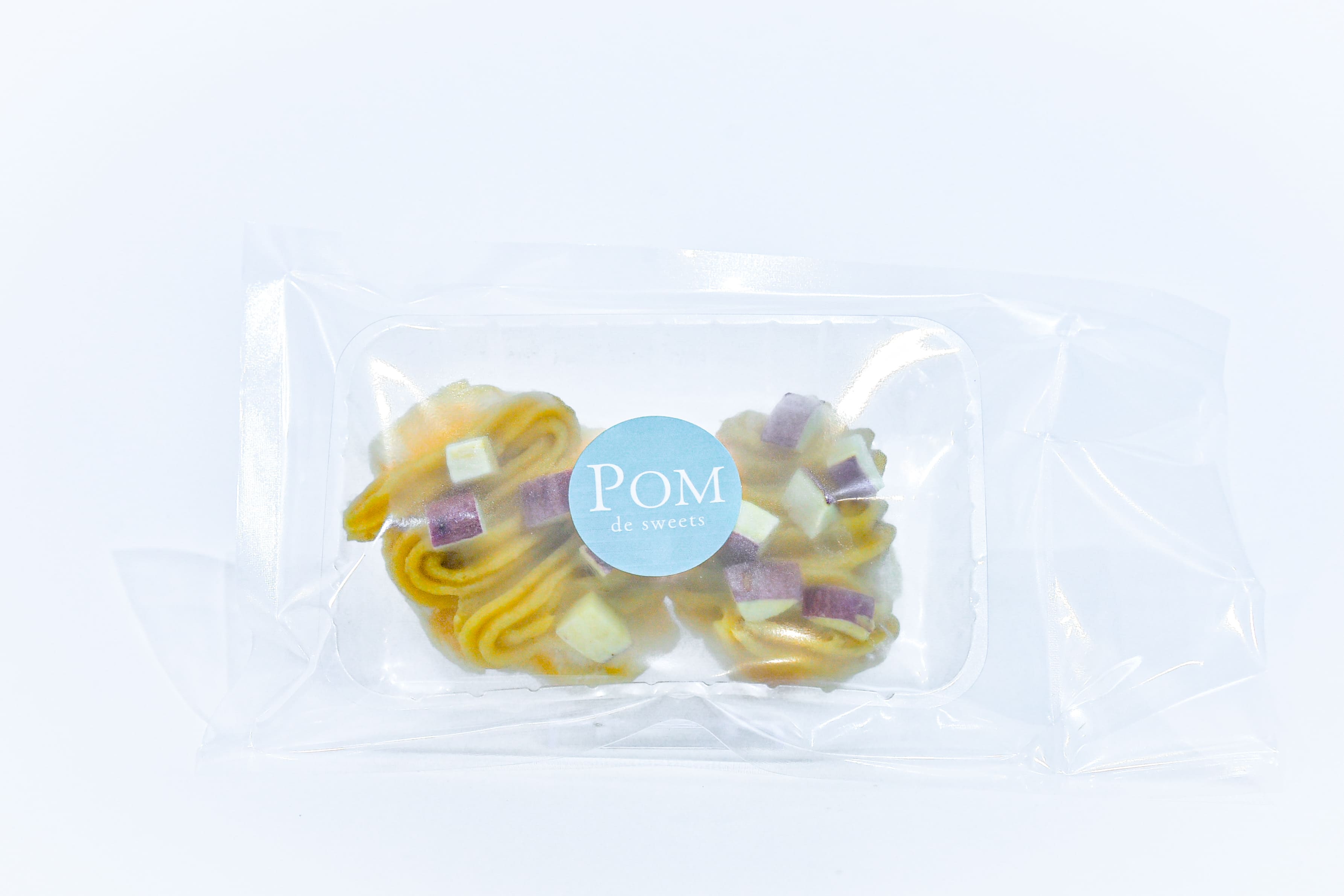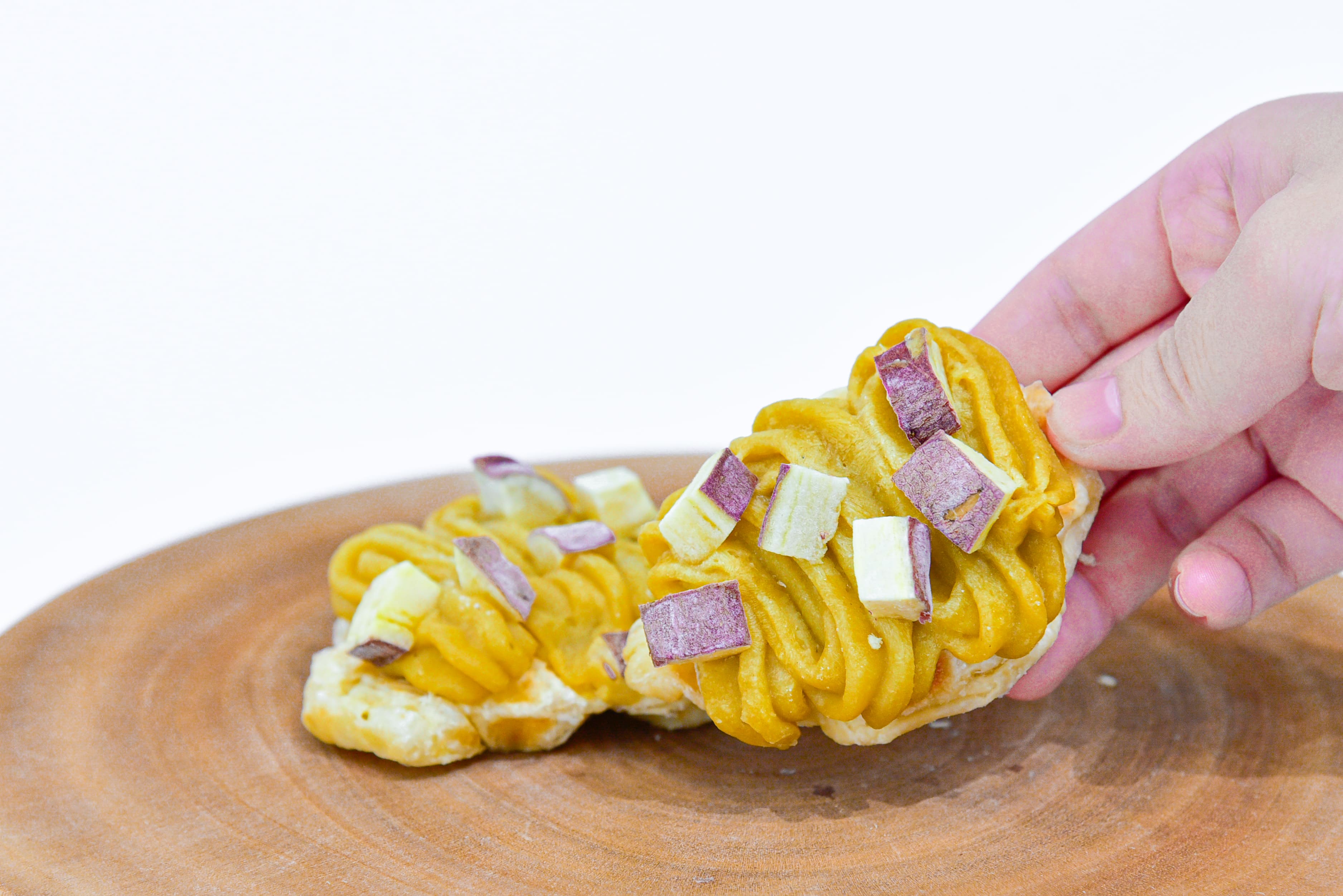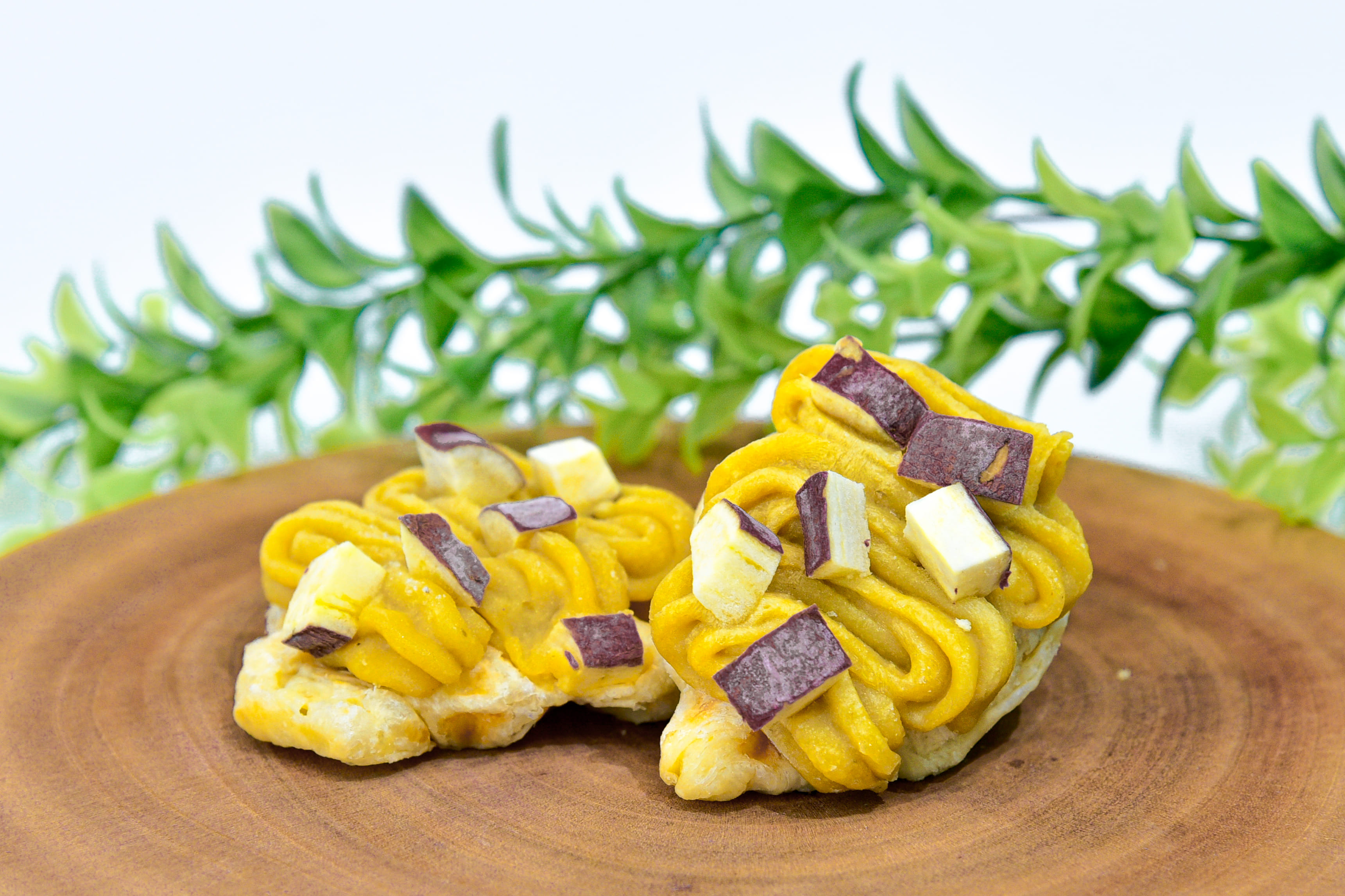 国産の甘み豊かな蜜焼き芋をスイートポテトに仕上げ、サクッとしたクロッフルの上にたっぷりと盛り付けしております。